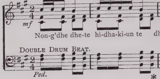 For example, when comparing the introduction of Hiawatha to the song Putting on the Insignia of the Thunder God, as published in Alice Fletcher’s ethnographic work, there are noticeable similarities. The rhythmic patterns and the descending melodic contour in both pieces are strikingly alike, suggesting that early composers may have drawn inspiration, whether consciously or not, from Indigenous musical sources documented by Fletcher.